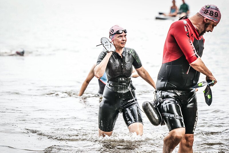 From the horizontal to the vertical: Nadine and Philip bravely tackled the four and a half kilometres in 23 degrees and glassy water. Philip led the way, followed by Nadine in the "water shadow" on the obligatory leash. With a mix of breaststroke and crawl strokes, they fought their way to the first running section. Now it paid off that the two of them had practised switching from the horizontal swimming position to the vertical running style in training. With every metre, they became more confident, but also happier. But no sooner had they savoured the feeling of routine than the second swimming section awaited them, which they also mastered brilliantly.