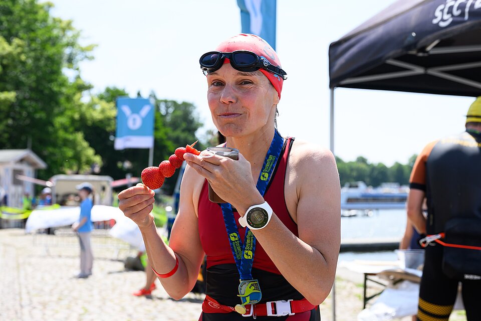 Dabei verlief die Vorbereitung alles andere als ideal: „Beim Rennen in Spanien hat mich eine Welle gegen einen Felsen geschleudert – Knieprellung. Laufen war erstmal nicht drin.“ Stattdessen wich sie auf Crosstrainer und Rad aus und konzentrierte sich auf das Schwimmen. Erst kurz vor dem Start in Rheinsberg konnte sie wieder Lauftraining absolvieren, wenn auch unter Schmerzen. „Aber das Rennen war mir einfach zu wichtig. Ich wollte unbedingt dabei sein.“